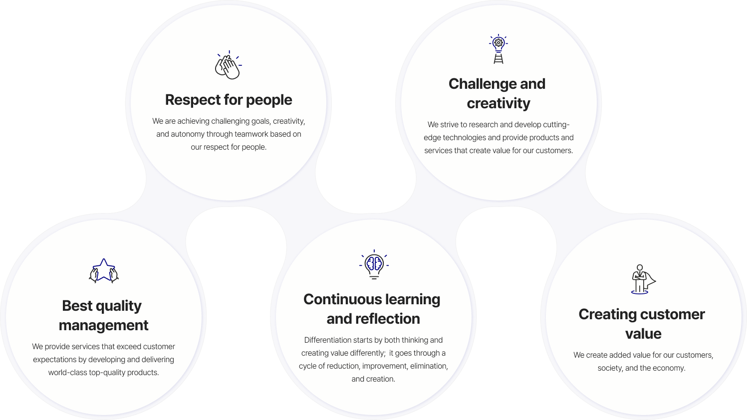 We are achieving challenging goals, creativity, and autonomy through teamwork based on our respect for people.
